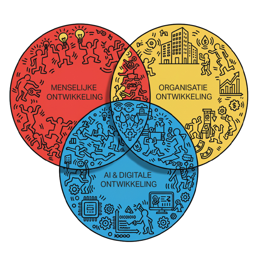 Met deze sleuteldomeinen ondersteunen we jou als leider of ondernemer om je organisatie te laten floreren: samen met je mensen, versterkt door AI en digitale innovatie.
